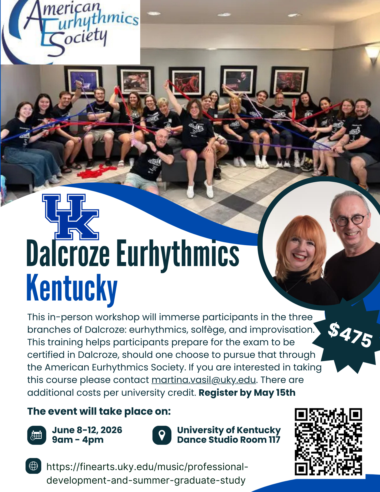 This in-person workshop will immerse participants in the three branches of Dalcroze: eurhythmics, solfège, and improvisation. This training helps participants prepare for the exam to be certified in Dalcroze, should one choose to pursue that through the American Eurhythmics Society. If you are interested in taking this course please contact martina.vasil@uky.edu. There are additional costs per university credit. Register by May 15th