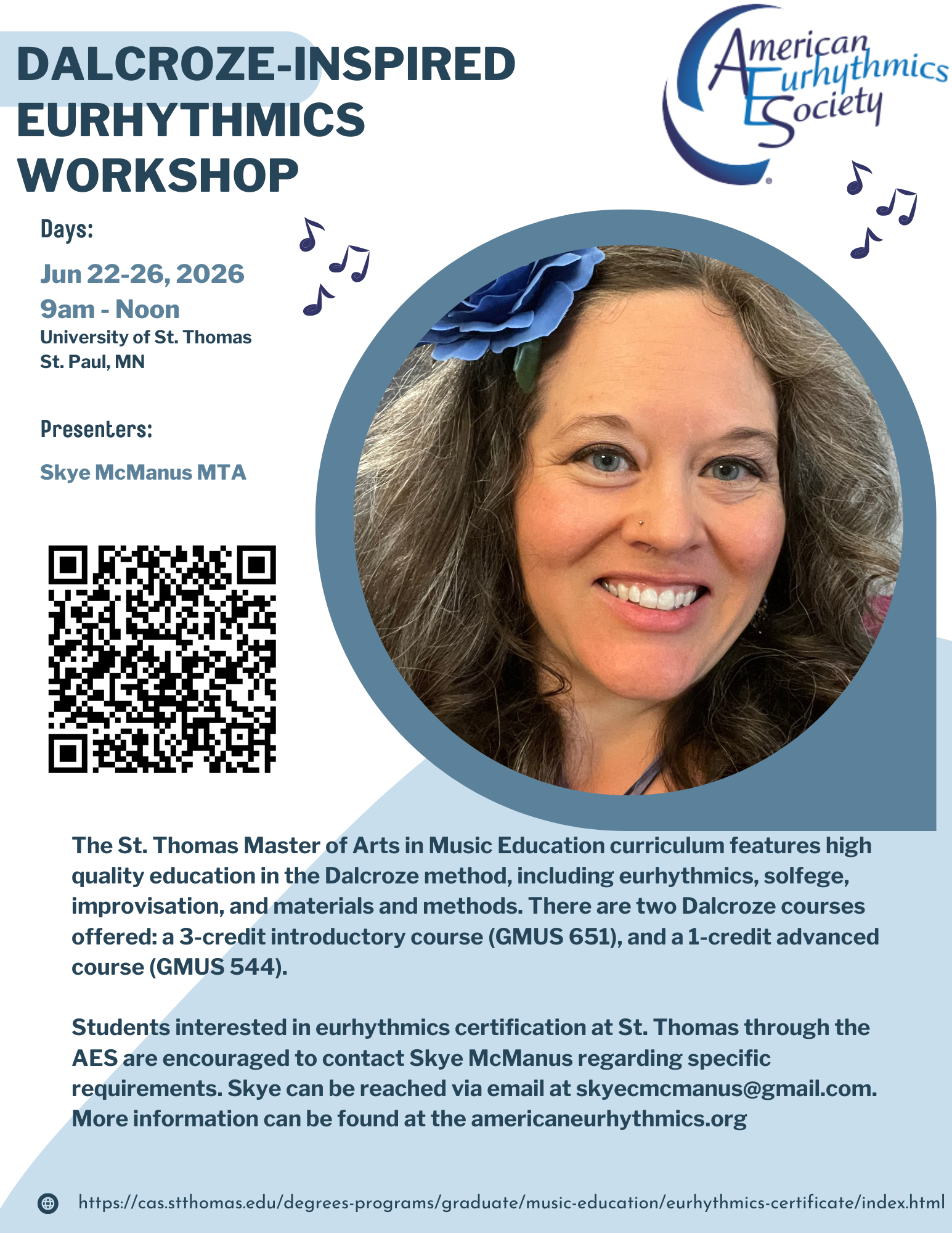 Students interested in eurhythmics certification at St. Thomas through the AES are encouraged to contact Dr. Kathy Thomsen regarding specific requirements. Dr. Thomsen can be reached via email at thom8668@stthomas.edu. More information can be found at the americaneurhythmics.org