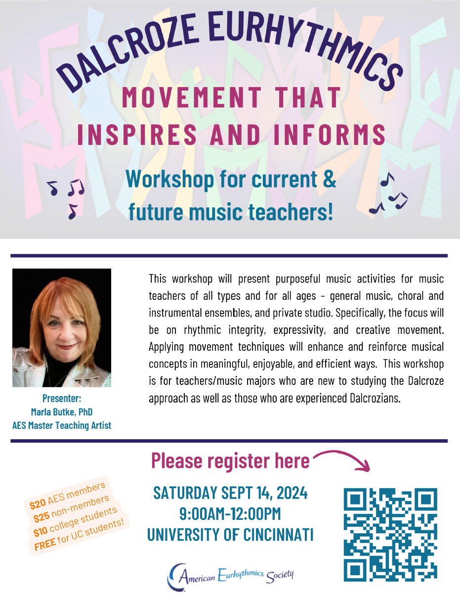 This workshop will present purposeful music activities for music teachers of all types and for all ages – general music, choral and instrumental ensembles, and private studio. Specifically, the focus will be on rhythmic integrity, expressivity, and creative movement. Applying movement techniques will enhance and reinforce musical concepts in meaningful, enjoyable, and efficient ways. This workshop is for teachers/music majors who are new to studying the Dalcroze approach as well as those who are experienced Dalcrozians.