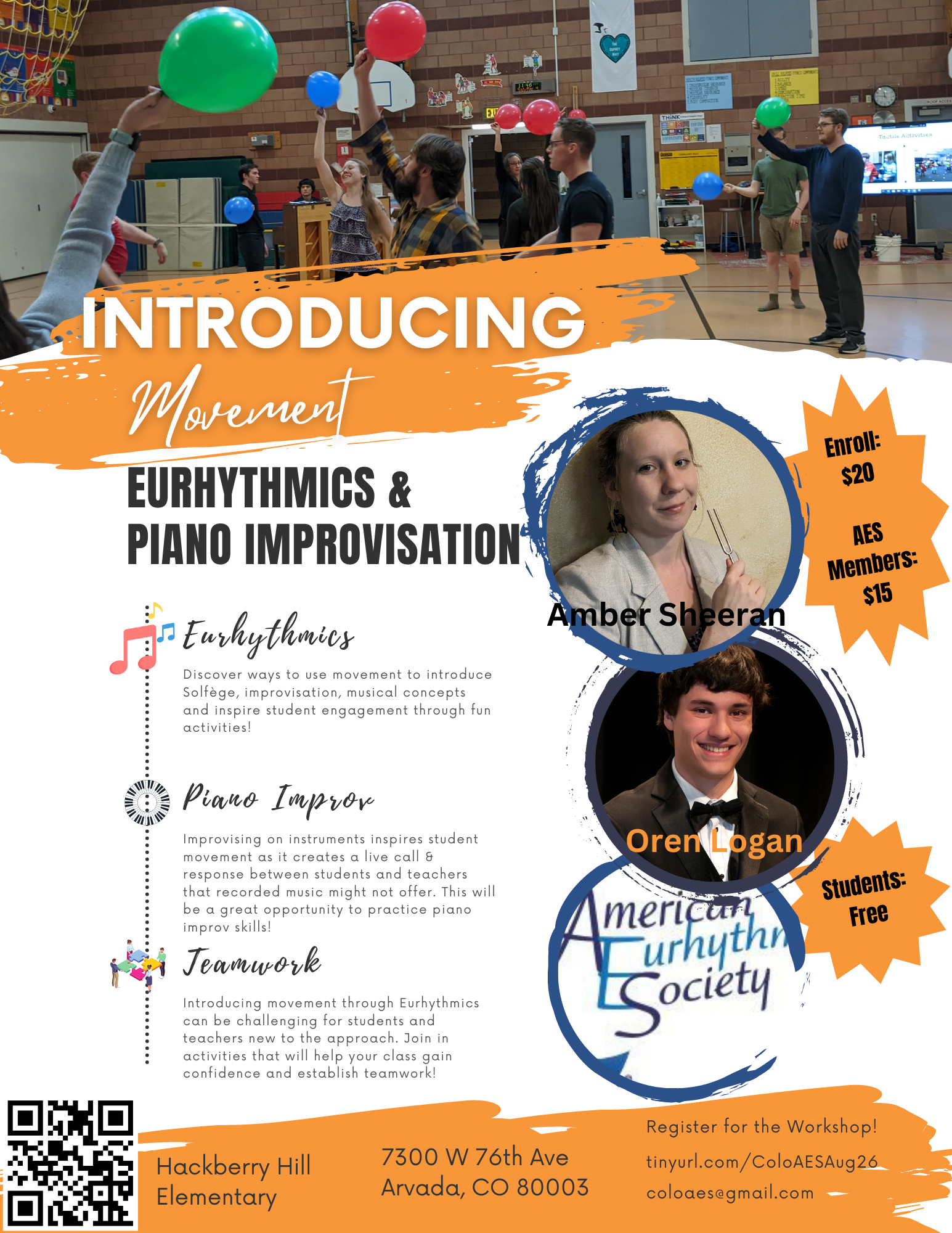 Join Amber Sheeran and Oren Logan for a 3-hour workshop on Introducing Movement and beginning Piano Improvisation hosted by the Colorado Chapter of the American Eurhythmics Society (AES).